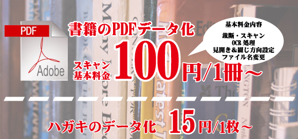 【書籍のデータ化】書籍データ化サービスは、お客さまが所有されている書籍をお送りいただき、書籍の綴じ部分を裁断した後にスキャナーで読み込み、パソコン、タブレット、スマホなどの機器で閲覧可能なデータに変換するサービスです。 下記リンクページに含まれる作家の作品は当店ではスキャンを行っておりません。ご注文の前に必ずご確認ください。 無料でご利用いただける「無料お試し」サービスをご用意しております。画質やOCR精度のご確認などにご利用ください。 |